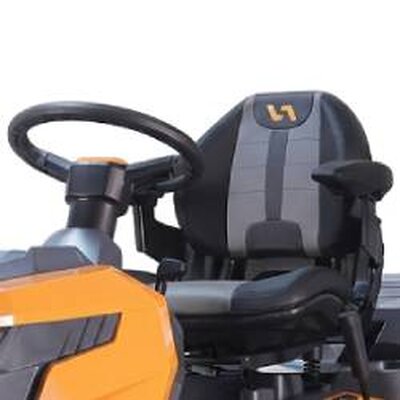 - Трактор оснащен интеллектуальной системой контроля заполнения: на LED-дисплее загорается световой индикатор и срабатывает звуковое оповещение, когда контейнер полон. Для максимального удобства оператора опустошение травосборника производится с помощью специального рычага, не покидая сиденья.